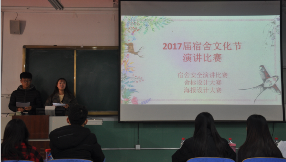 为营造良好宿舍文化氛围,加强宿舍成员安全意识,打造桃花族论坛 特色文化宿舍,12月9日下午,由桃花族论坛 团委主办,学生会宿管部、纪检部、卫生部联合承办的2017届宿舍文化节演讲比赛在文史楼315室举办,学生会主席团部分成员担任评委。