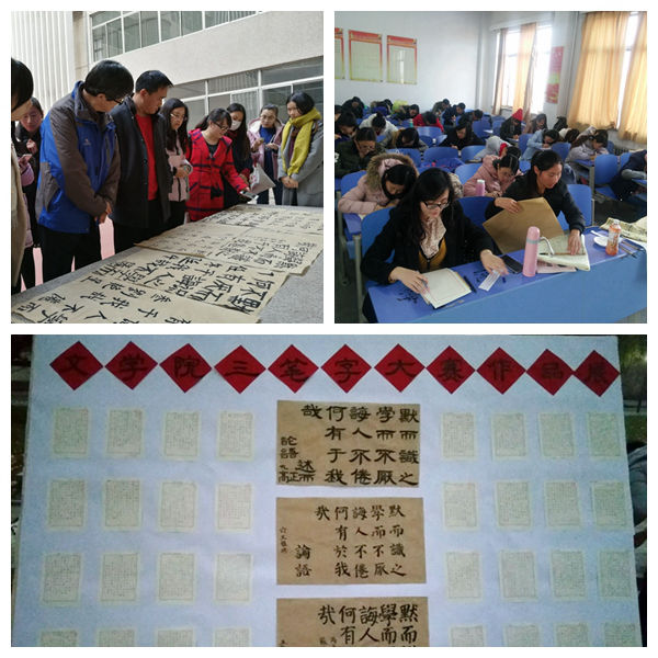 为提高我院研究生的书法水平,增强对汉字的亲和力,11月30日下午2:30,由桃花族论坛 研究生会主办,就业服务部和学习学术部承办的“三笔字”大赛圆满结束,此次比赛分别在羽毛球场地和文史楼512教室同时举行。本次比赛邀请张建勇、焦福民老师担任评委,为大家的书法作品进行点评,我院百余名研究生积极参与。
