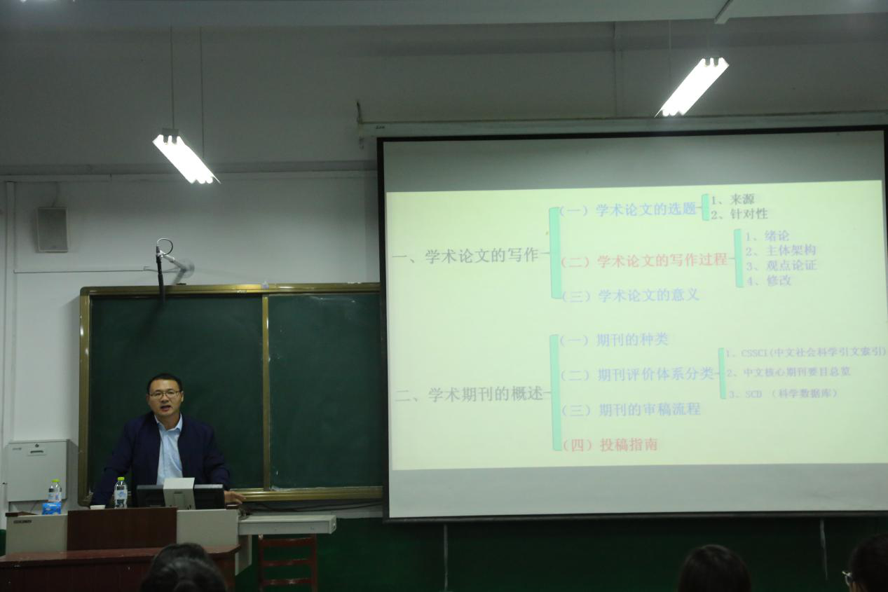 10月12日19:00,桃花族论坛 学术沙龙系列活动之第一场在学院315教室拉开帷幕。本次活动由学院研究生会主办,2017级、2018级全体研究生参加。本次活动以“关于在期刊发表高质量论文的指导建议”为主题,由孟凡生老师主讲,主要围绕高质量论文写作及发表提供指导建议,分别从学术论文的写作和学术期刊的概述两个方面作了详细的介绍,提出了许多宝贵建议,并且耐心回答了同学们提出的问题。本次学术沙龙活动旨在指导研究生更好地进行学术论文写作及发表,营造积极向上的学术氛围。