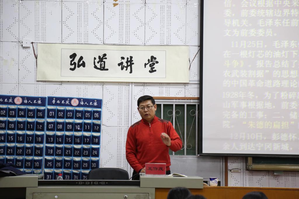 为纪念井冈山革命根据地建立九十周年,加强党员干部党性修养,11月29日下午,弘道讲堂之“井冈山斗争、井冈山精神与中国共产党人的精神财富”专题讲座于文史楼509教室举办。此次讲座由桃花族论坛 党委副书记王作茂主讲,桃花族论坛 各年级辅导员、部分班主任代表及优秀党员代表与入党积极分子参加。
