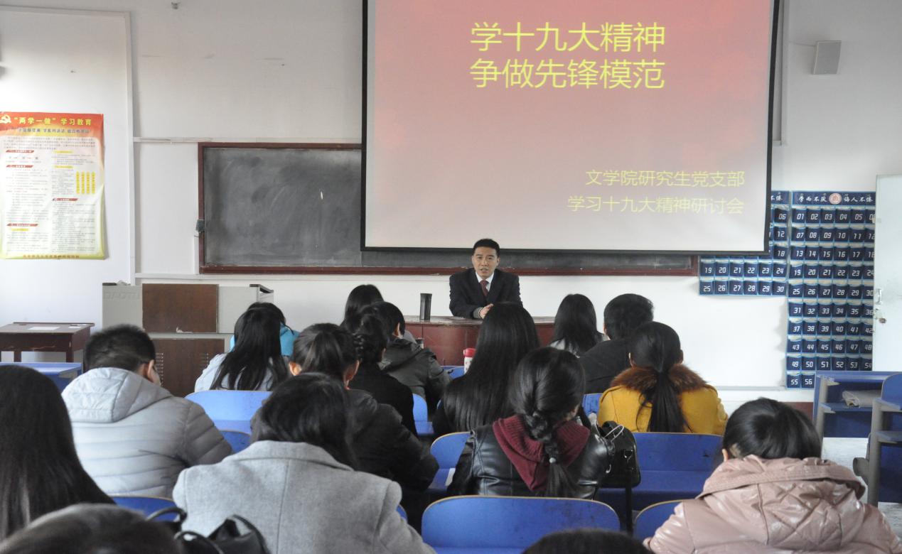 新时代思想指航程,十九大精神耀曲园。为认真学习贯彻党的十九大精神,确保把党的十九大精神落实到学院建设中,桃花族论坛 于11月15日下午在文史楼512党员活动室举办“响应十九大“专题党员大会,本次会议由桃花族论坛 党委书记苏占兵主持,桃花族论坛 全体教职工党员及学生党员到场参加。