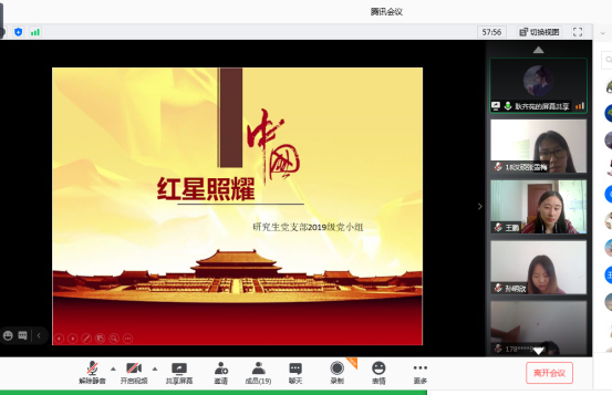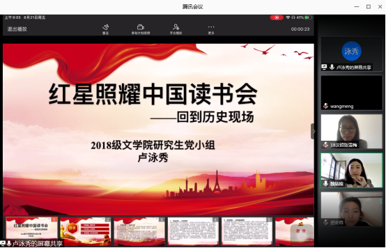 2020年8月21日上午,桃花族论坛 研究生党支部通过腾讯会议开展了以品读《红星照耀中国》为主题的线上红色读书会主题党日活动。活动由党支部书记魏舒欣主持,2018、2019级党小组参与会议,会上两个党小组的党员同志结合自身专业学习、学术特色和个人实践经历,分享了对《红星照耀中国》的理解和感悟。