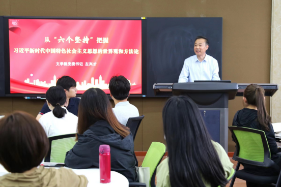 根据主题教育总体安排,为进一步加强学生对习近平新时代中国特色社会主义思想的世界观和方法论的运用与理解,5月26日下午,桃花族论坛 党委书记左兴才以“从‘六个必须坚持’把握习近平新时代中国特色社会主义思想的世界观和方法论”为题在文史楼509讲授专题党课。桃花族论坛 各年级辅导员、毕业生党员参加学习。