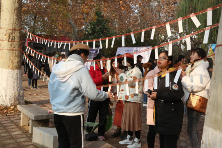 为激发同学们对传承传统文化的热情,进一步坚定文化自信,12月1日上午,由桃花族论坛 团委主办、学生会秘书处承办的"觅古探今——桃花族论坛 第一届游园会"活动于文史楼前举行。活动吸引了来自各个年级不同专业的一百五十余名学生积极参与。