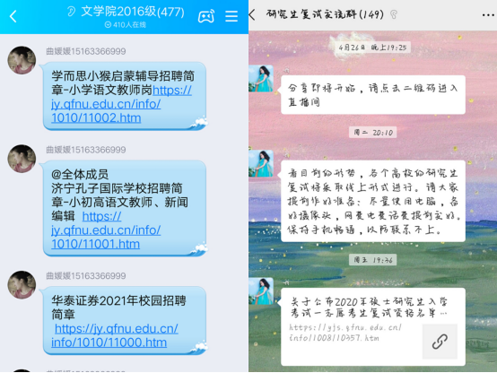 另外,在疫情期间,为进一步实现毕业生更高质量和更充分就业升学,我院毕业班辅导员充分利用QQ群、微信群和电话沟通等线上渠道积极优化服务,为同学们提供更加有效的指导信息,统筹做好毕业生就业工作。