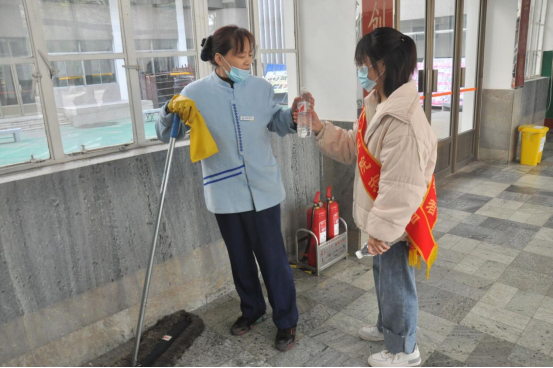 此次志愿活动的另一重要内容是帮助物业阿姨打扫系楼卫生。志愿者们协助打扫系楼的卫生,为系楼的整洁贡献自己的力量。在打扫的过程中,志愿者们体会到了劳动的快乐,用自己的实际行动践行了“为人民服务”的雷锋精神。在换班的间隙志愿者们还给工作人员送去了矿泉水表示关心和感谢。
