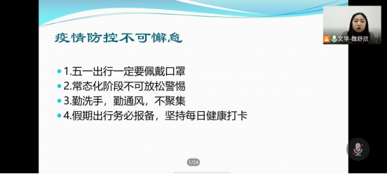 本次会议主要围绕学生交通安全、用电安全、财产安全、饮食安全、疫情防控、五一假期放假安排及注意事项六个方面具体展开。会议中,魏舒欣老师首先从不同出行方式具体谈需要注意安全的地方,并以图片的方式向同学们介绍了货车致命的盲区。其次,魏老师强调在宿舍严禁使用违规电器,严禁私拉电线,严禁抽烟,严禁电动车室内充电,做到人走断电。在财产安全方面,魏老师提醒大家要保管好贵重物品,警惕网络诈骗,保管好各类证件,拒绝各种“贷”,理性消费。接着,魏老师提到天气越来越热了,要格外注意饮食安全,选择健康、干净的地点就餐。然后,魏老师再次强调疫情防控不可懈怠,五一假期出行要配戴口罩,坚持每日健康打卡,应尽量减少出行,如若出行,务必做好出行报备工作。最后,魏老师详谈了五一假期放假安排以及注意事项,并提前预祝大家假期愉快。至此,本次会议圆满结束。