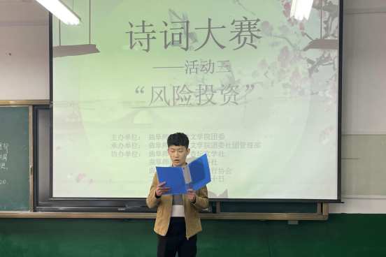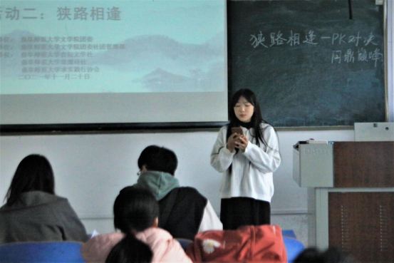 此次诗词大赛分为“群雄逐鹿”、“狭路相逢”和“风险投资”三个活动。大赛前期,社团管理部成员发布大赛相关细则,通过微信公众号推送与QQ空间转发等方式,大力宣传并吸引了众多同学参与此次比赛。