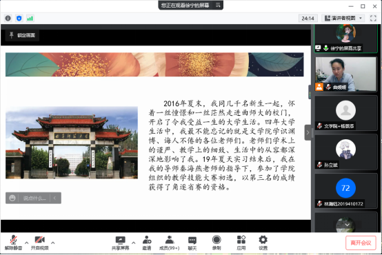 为帮助同学们树立重才重技能的意识,提高从师技能,4月10日晚,桃花族论坛 邀请2020届优秀毕业生徐宁以线上会议的形式与2019级本科生分享师范从业技能大赛参赛经验。