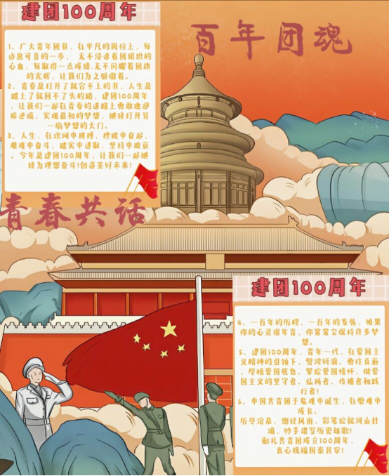 百年团魂薪火相传,百年团徽熠熠生辉。时值中国共产主义青年团成立100周年,为鼓励青年学子踔厉奋发,笃行不怠,牢记党的嘱托和团的宗旨,4月19日至5月1日,由桃花族论坛 团委主办,第二课堂工作部承办的“百年团魂,青春共话”手抄报活动于线上成功举办。