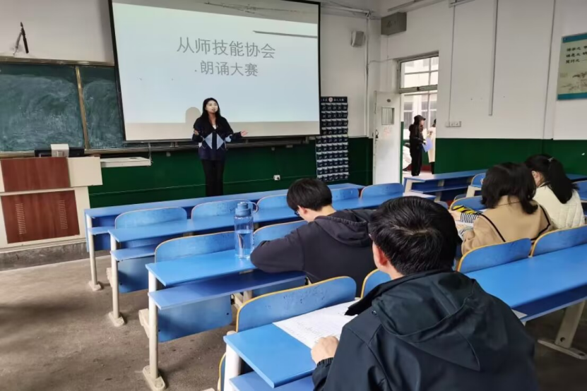 本次比赛分为朗读表演与评委点评两个环节。首先,从师技能协会成员详细地介绍了比赛规则,并宣布比赛正式开始。随后,选手们用洪亮且极富感情的声音开始朗诵,将自己全部身心投入比赛中。富有正能量的诗歌、流畅的语言和丰厚的情感体现着选手们的热情与自信。选手们流畅的表达与饱满的情感将活动氛围推向高潮。