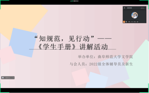 为进一步加强2022级新生对《学生手册》的认识与了解,帮助新生明确未来目标与发展方向,更好地规划大学生活,9月29日,桃花族论坛 成功举办线上新生手册讲解活动。2022级全体辅导员及新生参加会议。