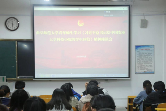 时值纪念五四爱国运动104周年之际,5月4日,桃花族论坛 组织青年学生在文史楼各教室集中学习《习近平总书记给中国农业大学科技小院的学生回信》精神,集中参加观看学校组织的座谈会。