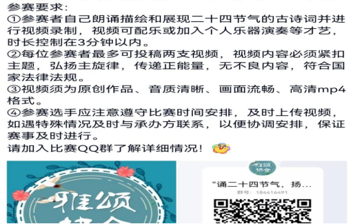 活动前期,雅颂协会成员通过社团公众号、QQ群等媒体平台进行线上宣传,吸引同学们积极参与本次活动。社团成员积极进行前期准备工作,确保活动顺利进行。在本次诗词朗诵大赛中,参赛同学通过朗诵来描绘和展现二十四节气的古诗词并进行视频录制,将二十四节气娓娓道来,于切身体验中领悟诗词的磅礴底蕴与中华文化的博大精深。活动最后,经过评委的公开评选和打分,以及QQ空间开展的集赞评选活动,最终评选出一等奖一名、二等奖三名、三等奖五名。