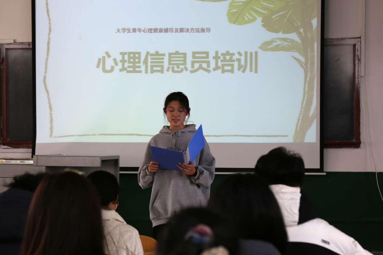 培训由学院心理健康辅导员高原老师和心理健康部成员张夏宁、周瑞为心理信息员讲解相关知识。在第一部分讲解中,高老师从“关注他人,提升自己”阐述心理委员和心理信息员的工作职责,详细讲解心理委员以及心理信息员所应该具备的聆听他人、尊重他人、温暖他人等素养。同时,高原老师对心理咨询的方式进行介绍并分享自己心理咨询的实例。高老师的讲解内容生动形象、趣味盎然,让同学们在笑声中进一步掌握正确的心理咨询方式。在第二部分讲解中,心理健康部干事张夏宁、周瑞为心理委员与心理信息员分析常见的心理问题,如情绪低落、沉迷网络等,从形成原因和表现形式等方面入手,解决并提供处理常见心理问题的方案。