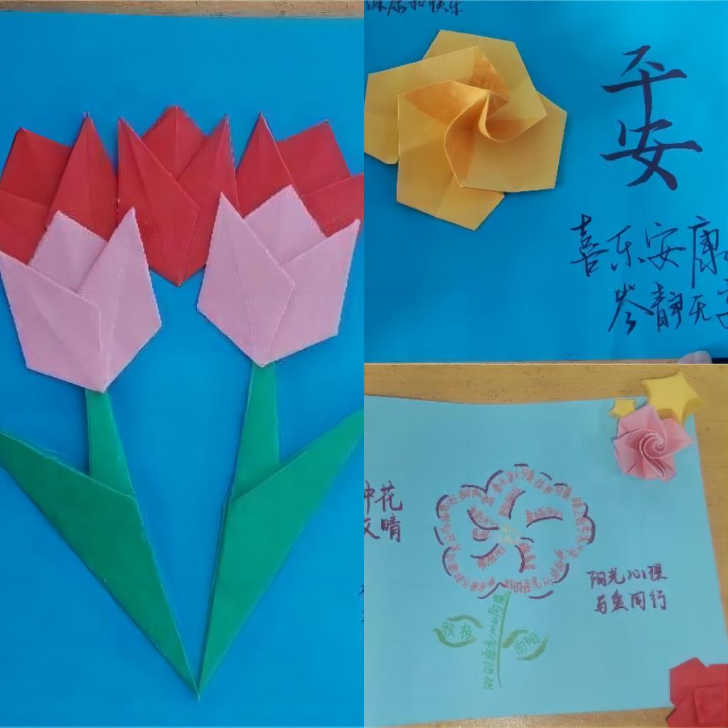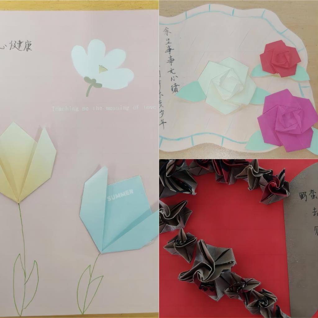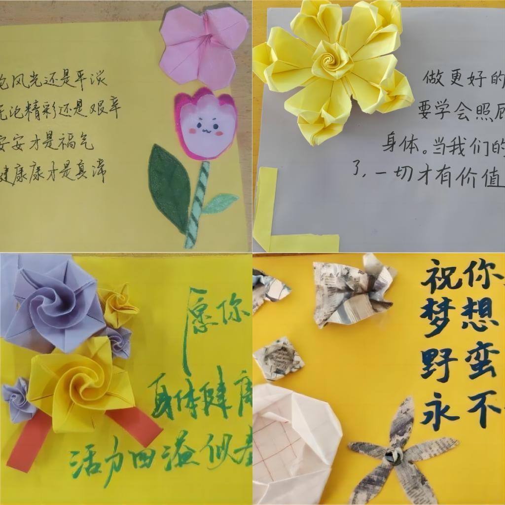 活动前期,志愿服务部的志愿者们为同学们准备好彩纸、胶棒、黑色签字笔、剪刀等物品,并让同学们根据自己的创作需要进行有序领取。活动过程中,同学们充分发挥创新思维,创造出丰富多彩的作品。用彩纸折出各色的花朵,不同的颜色代表着不同的寓意,并在作品上撰写健康标语,这些标语传递了他们对家人朋友的美好祝愿以及对健康生活的追求。活动最后,同学们积极分享有关健康生活的经验,在相互交流中学到许多有关健康生活的方法。