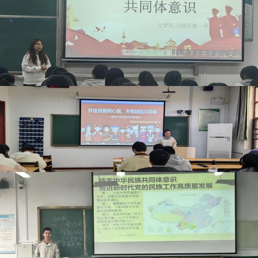 汉师六班以“携手并进,共铸中华民族共同体意识”为主题召开班会,班长曹诗然主持。曹诗然向大家介绍了铸牢中华民族共同体意识的核心理念,随后,同学们一起观看了有关铸牢中华民族共同体意识的主题宣传片。同学们纷纷表示,要为实现中华民族伟大复兴贡献青春力量,积极投身于民族团结进步的伟大事业中。