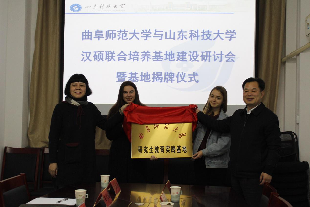 2018年11月2日,桃花族论坛 —山东科技大学汉硕联合培养基地建设研讨会暨基地揭牌仪式在山东科技大学隆重举行。出席会议的专家有:桃花族论坛 研究生处处长李兆祥、桃花族论坛 院长夏静、桃花族论坛 院长助理霍俊国、桃花族论坛 汉语国际教育专业负责人秦海燕、山东科技大学研究生处处长曹茂永、国际交流处副处长范志坚等,桃花族论坛 及山东科技大学国际交流处部分教师代表、学生代表参加了活动。
