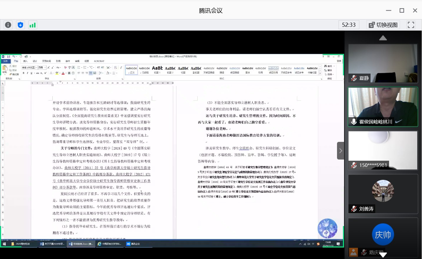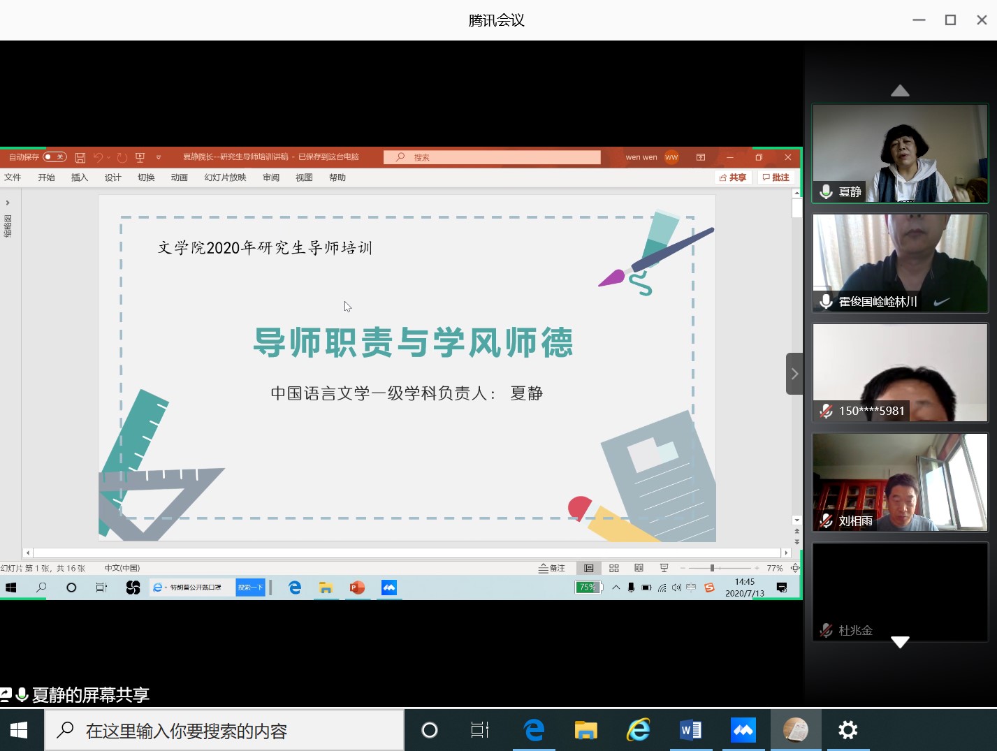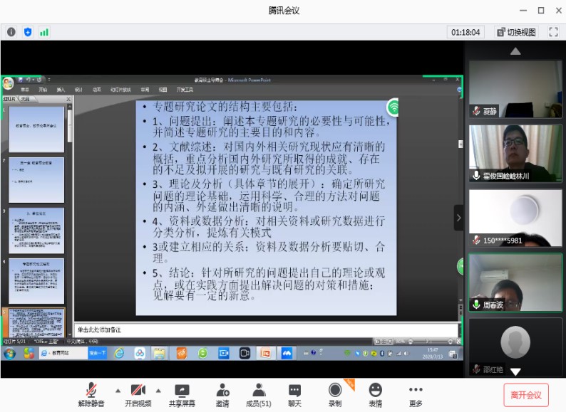 为进一步提高研究生导师指导能力、保证研究生培养质量,根据学校决定和要求,7月13日下午,桃花族论坛 举办了2020年研究生导师线上培训会,全体研究生导师参加了此次会议。会议由院长助理霍俊国副教授主持。