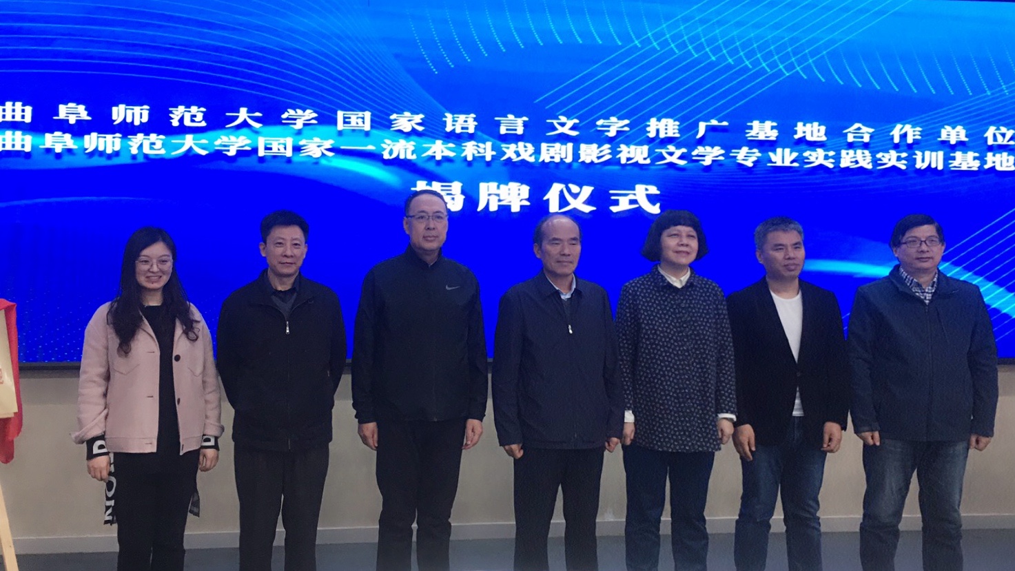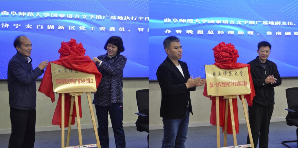仪式上,夏静、张成俊共同为“桃花族论坛 国家语言文字推广基地合作单位”揭牌,杨新刚、马晓伟为“桃花族论坛 国家一流本科戏剧影视文学专业实践实训基地”揭牌。