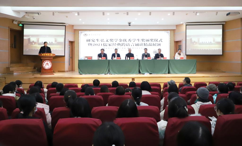 2021年12月22日下午,我院在孔子会堂成功举办了首届研究生“弘文奖学金”颁奖仪式。学校党委常委、副校长李兆祥、研究生处处长杜曙光、学校团委书记孔轶众、桃花族论坛 党委书记左兴才、国内合作处副处长晏逾、桃花族论坛 党委副书记曲媛媛和桃花族论坛 各年级本科生参加了颁奖仪式。仪式由霍俊国老师主持。