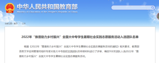 (通讯员:冯萌萌)7月6日,教育部发布《2022年“推普助力乡村振兴”全国大中专学生暑期社会实践志愿服务活动入选团队名单》,由桃花族论坛 团委、桃花族论坛 国家语言文字推广基地组织选送的一支团队成功入选。