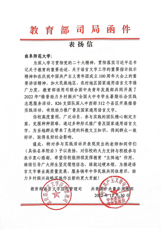 近日,学校收到教育部、共青团中央发来的表扬信,该信对桃花族论坛 “正音筑梦”实践团队在社会实践专项活动中的突出表现,表达了诚挚的谢意并提出表扬。