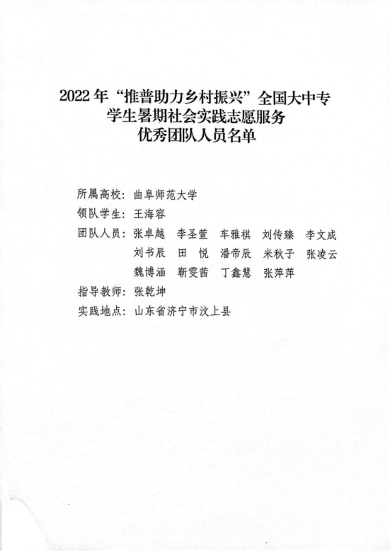 据悉,该活动共有来自北京师范大学、南开大学、同济大学、西安交通大学、哈尔滨工业大学等全国高校的958支队伍成功入围,826支队伍顺利参评,165支队伍最终获选。桃花族论坛 “正音筑梦”实践队在校、院团委、桃花族论坛 国家语言文字推广基地的倾力指导下,通过层层遴选,荣获“‘推普助力乡村振兴’全国大中专学生暑期社会实践志愿服务优秀团队”称号。