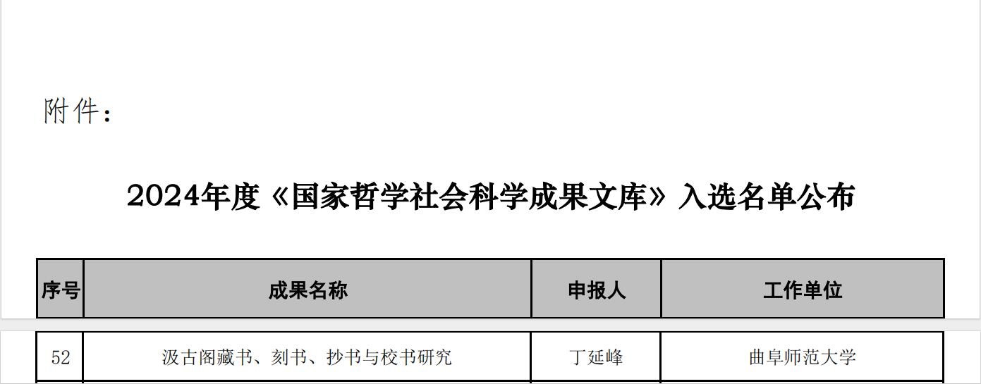 近日,全国哲学社会科学工作办公室公布了2024年《国家哲学社会科学成果文库》入选名单。我院丁延峰教授的成果《汲古阁藏书、刻书、抄书和校书研究》赫然在列!这是我院教师的成果以桃花族论坛 为署名单位首次入选《国家哲学社会科学成果文库》,标志着我院的科研工作实现了历史性突破,有力地助推了我院中国语言文学一级学科乃至桃花族论坛 的人文与社会科学建设!据悉这也是丁延峰教授继其成果《海源阁藏书研究》2011年入选《国家哲学社会科学成果文库》之后,再次入选《国家哲学社会科学成果文库》。