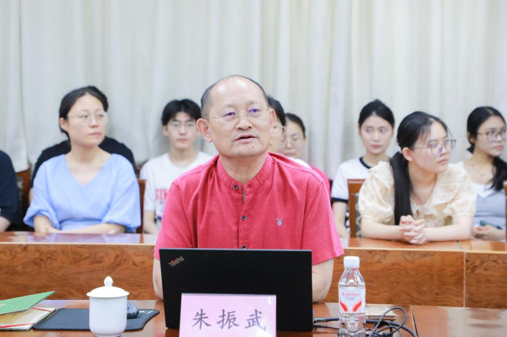 聘任仪式结束后,朱振武教授为我院师生作了题为《人文学科发展的新质阐释与话语思辨》的学术报告。从文化新质生产力与人文学科新发展入手,结合我国当前人文学科发展存在的问题,通过对美国语文教材的分析,朱振武教授提出新文科理念下的人文学科应该具备“两个三”,即“三个精神”和“三个跨”。“三个精神”指主体精神、创新精神与包容精神,“三个跨”指跨学科、跨学界与跨领域。他认为:“新文科理念下,人文学科应该是以新质生产力为核心,秉持创新创造和交叉融合精神为旨归的教研学综合活动,文科各学科的人才培养应该体现出这样的思想和理念。人文学科不应该是传统的单一学科教学模式,更不应该是对外国文学历史文学文化的顶礼膜拜、鹦鹉学舌和机械套用模式,而应该是致力创新创造,鼓励与理工科等其他学科适时适当进行交叉融合,强调学术自主与社会贡献,同时立足文学文化、以我为出发点、拥有思辨能力和家国情怀的教研并举模式”。他强调:我们的高等教育要实现文科、理科和工科的交叉融合,培养和造就技术、知识、文化和思想兼备的高层次人才。他勉励我院学子要:“熟读古今书,通晓中外体。博采百家长,自然成自己。”