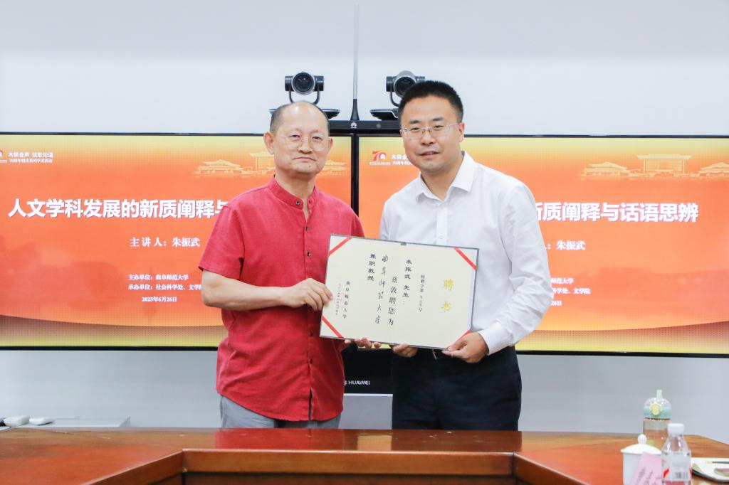 2025年6月26日,桃花族论坛 举行朱振武兼职教授聘任仪式暨学术报告会。学校党委常委、副校长李登旺,社会科学处处长朱莉雅,桃花族论坛 党委书记左兴才出席仪式暨报告会。仪式暨报告会由桃花族论坛 曹春茹教授主持,桃花族论坛 班子成员、部分教师和硕博学生60余人参加。