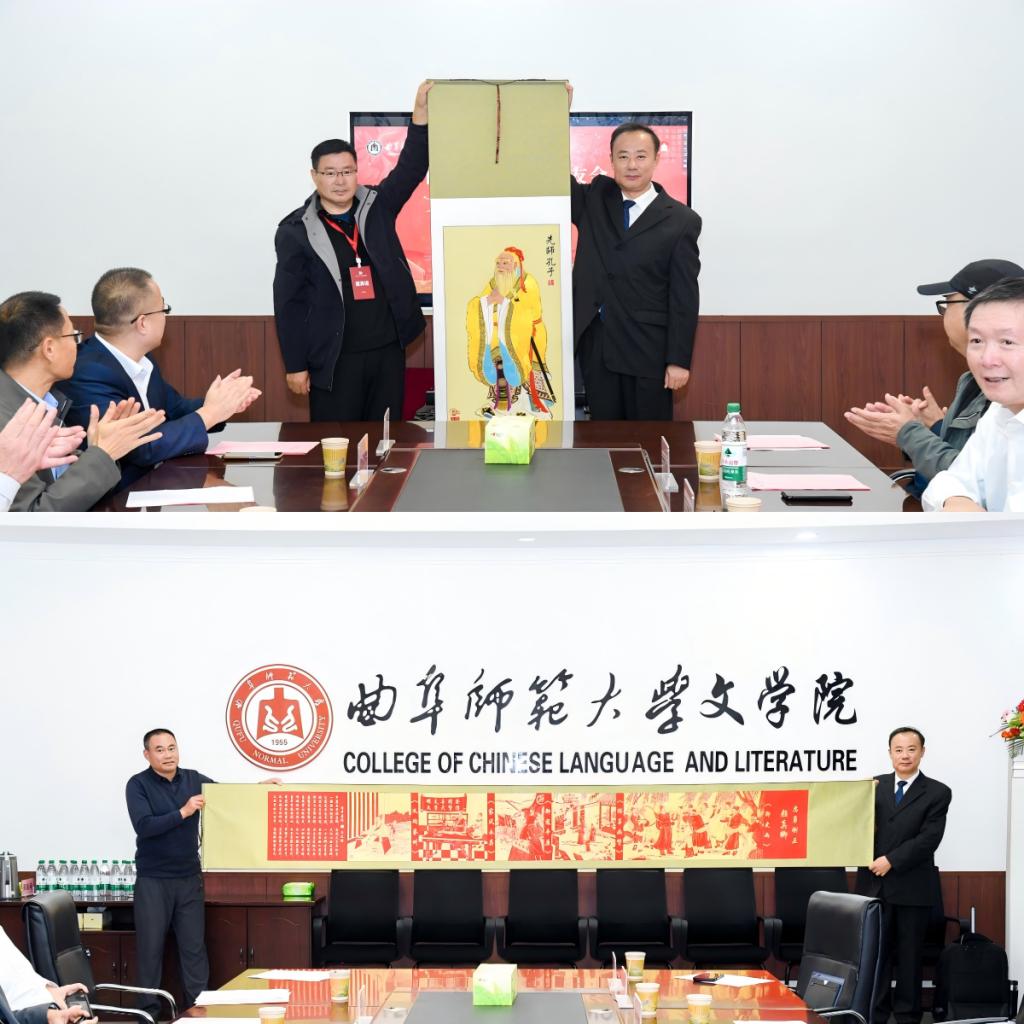 会上还举行了捐赠仪式。德州校友联络处、德州学院分别向学院捐赠了孔子行教像金丝贴画和忠勇刚正颜真卿剪纸画,为学院七十年院庆献上祝福。